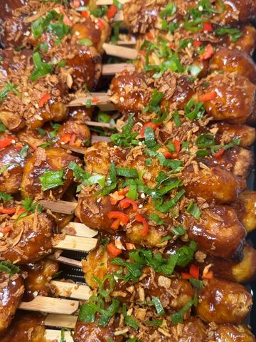 Crispy chicken balls skewered glazed in rich smoky sweet, salty and sour Sticky Korean BBQ sauce with a touch of sesame. Fresh chilies and crispy onions to garnish.
